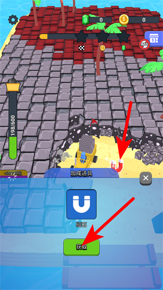 2、挖掘过程中,可获取加成道具,如磁石,点击获取按钮使用道具,助力资源收集。
