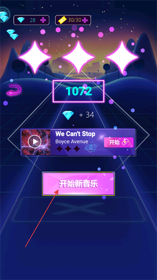 4、一局结束,查看获得的钻石数量,点击开始新音乐,开启下一首音乐对应的射击关卡。