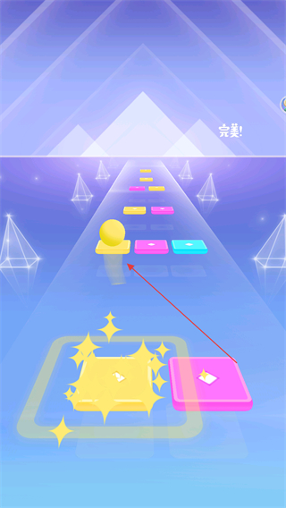 1、操控小球落到黄色方块上,触发完美!评价,保持节奏匹配方块颜色推进。