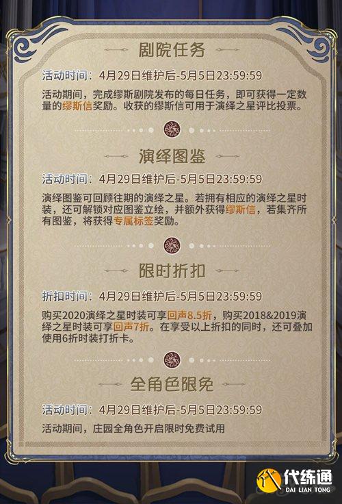 绎之星活动含投票和公示两个阶段,投票时间为4月29后系统更新之后直到5月5日0点之前,而公示阶段即为5月6日至12日,投票的方式是给喜欢的角色赠送缪斯信,玩家们可以通过剧院签到完成人物来获得缪斯信作为选票,投票累计达到一定数量即可获得相应的奖励。