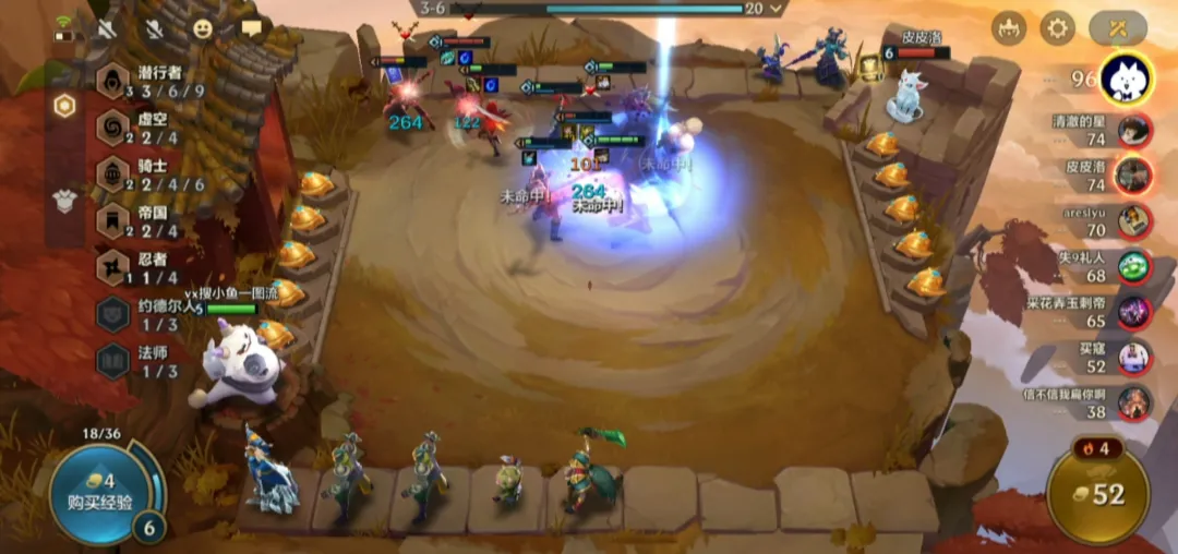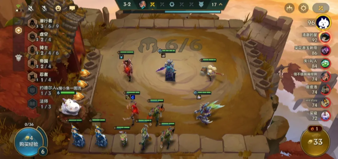 3-2升6:补足6人5个羁绊3潜2虚空2骑2帝国1忍,联系非常紧密,比如这个帝国之刃(卡特)带着潜龙刺的装备开大就秒光后排