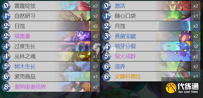 在安娜德的起手留牌方面,主要是以雷霆绽放,自然研习,日蚀,猜重量,过度生长,激活,月蚀,真菌宝藏,萌芽分裂,等低费卡牌为主。