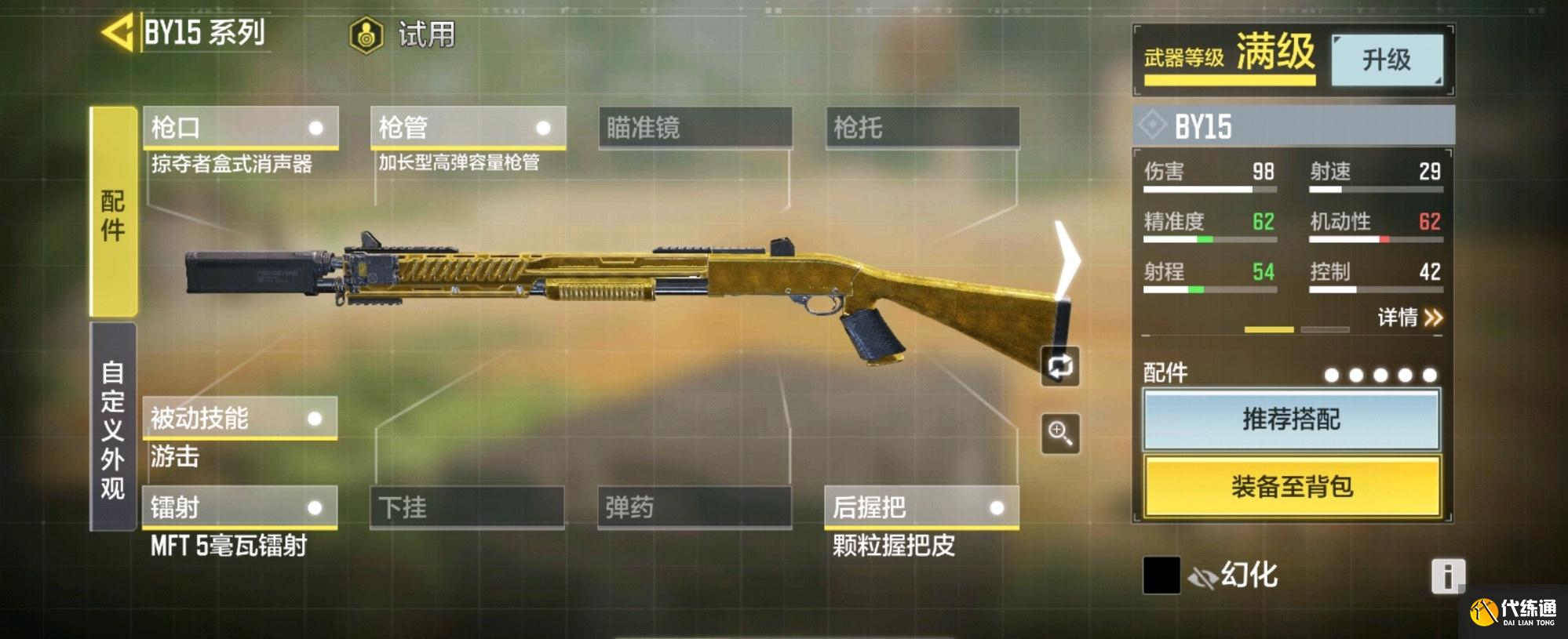BY15,作为散弹枪具有极高的伤害,达到了98,但射速只有29米每秒,适合近距离击杀敌人,在加装辅助镭射和消声器后,精准度达到了62,机动性能也达到了62,体量轻,适合于巷战,火力集中速度快,效果好,能够更好的突袭,射程只有54米,其优秀的瞬间伤害被广大小伙伴爱戴,适合打的稍准的玩家。