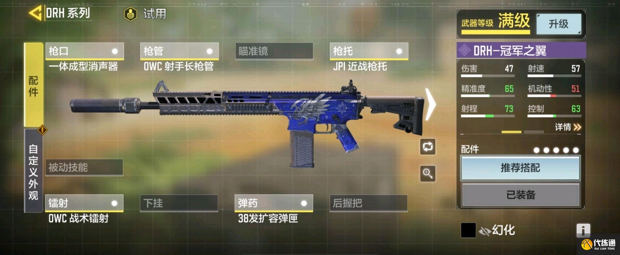 DRH,轻型突击步枪,伤害虽然没有散弹枪高但也达到了47,在加装消声器和镭射辅助之后能够达到57米每秒的射速,精准度达到了65,机动性能只有51,射程相对较大有73,控制性能更加优秀有63,属于突进型武器,适合与城市战,野战等突进速度快的战斗,有着便携伤害高的特点。玩家射击比较准的时候用这把枪比较好。