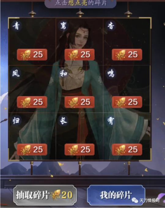 每获得25枚鸾羽,可在活动页面右侧的九宫格中,选择一块碎片进行点亮。当九块碎片全部点亮后,可以在获得20枚鸾羽时,点击右下角“抽取碎片”按钮,随机抽取一块碎片。