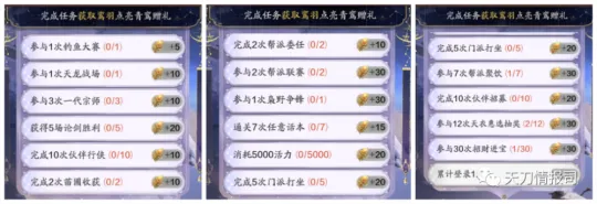 比如,参与一次钓鱼大赛可获得5枚鸾羽,完成10次伙伴行侠可获得10枚鸾羽,而完成5次论剑胜利,则可获得20枚鸾羽,任务详情如下:
