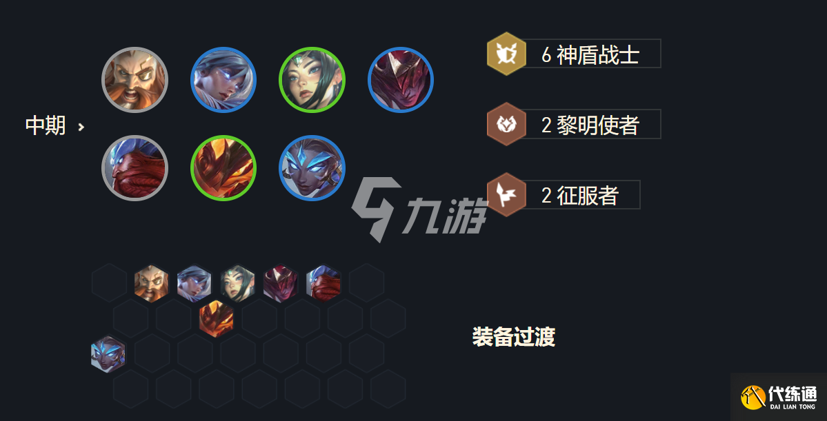 早期的过度阵容为:2黎明使者,3光明哨兵,2征服者,3神盾战士。