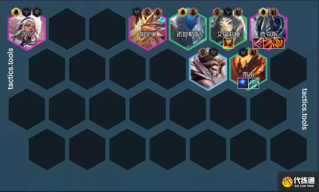7人口凯南、泰坦、刀妹、洛、武器、芮尔、加里奥组成3铁甲3光明3神盾2骑士羁绊,这个羁绊在中期的能力就已经非常强了,如果有2星的武器那么就是随便打了。