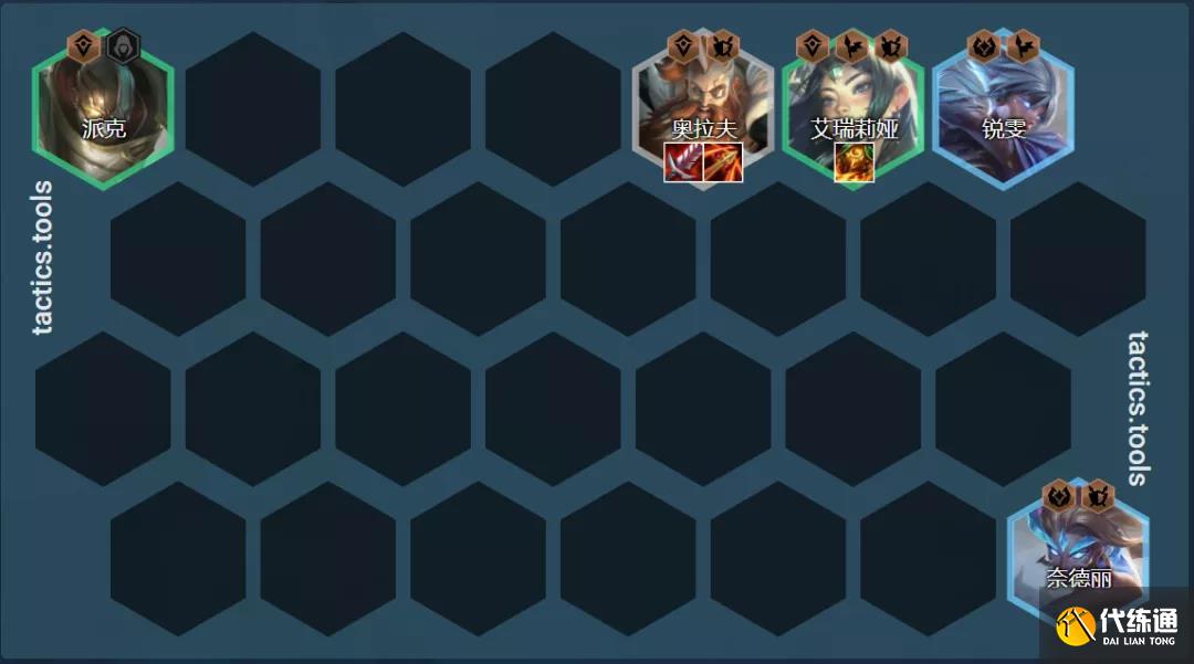 前期核心过渡思路是以奥拉夫为主,搭配奥拉夫+刀妹+派克/赛娜+乌迪尔/凯南/+剑魔/卡莉斯塔/锐雯凑出3神盾3光明2征服羁绊。饮血和羊刀/分裂弓/破甲弓给奥拉夫用上,2星奥拉夫就能够轻松过渡到7人口。