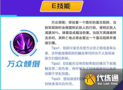 Tips2:E技能在没有控制帮助的情况下很唯触发第二段伤害,有时候为了对线强势可以选择前期不学此技能。