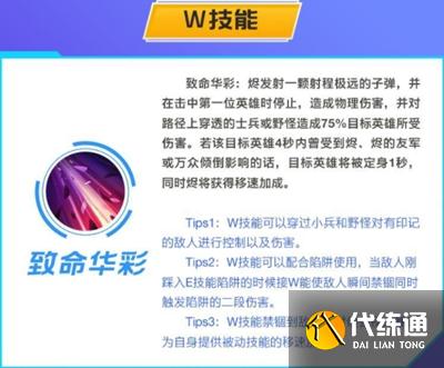 Tips2:W技能可以配合陷阱使用,当敌人刚踩入E技能陷阱的时候接W能使敌人瞬间禁同时触发陷阱的二段伤害。