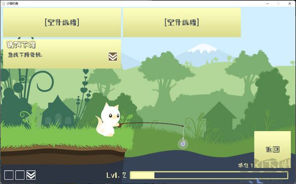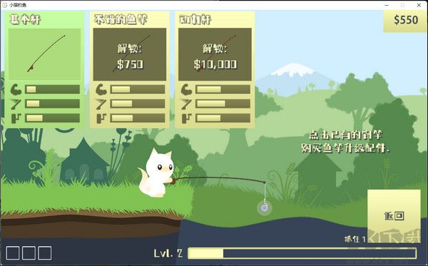小猫钓鱼中文版是款治愈风的休闲益智小游戏,画风简单可爱。你扮成软萌小猫咪坐在河边钓鱼,享受悠闲时光。操作特简单,长按鼠标就行,不同的鱼挣扎力度不一样,得考验控制技巧。钓上来的鱼卖掉能赚金币,用来买更好的鱼竿装备,配上高级装备才能钓到深水大鱼,来和小猫一起享受阳光、微风和钓鱼的乐趣,在宁静河边体验平和惬意的益智之旅吧。