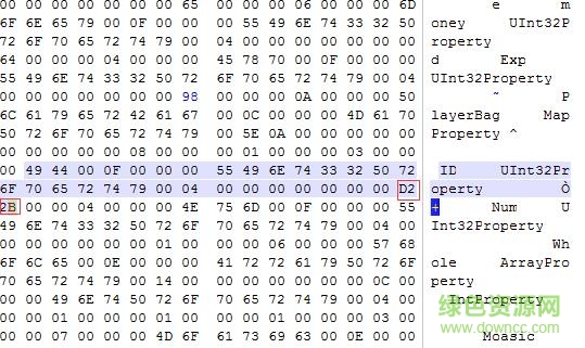 6.物品修改,找到ID Uint32Property并往后数至第十组,如下图红色区域,D2 2B就是该物品ID,可以替换掉想要的物品ID代码,保存。