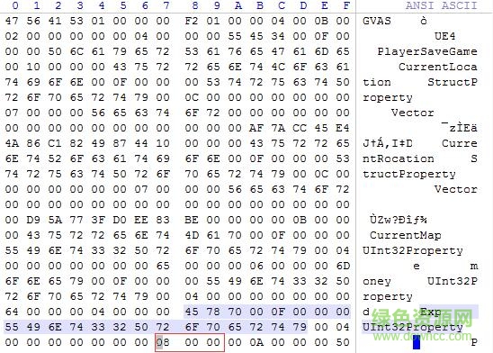 5.经验值修改,找到Exp Uint32Property并往后数至第十组,同样将08 00 00值改为7F 96 98,如下图红色区域,修改完成后,保存,进入游戏获得经验生效