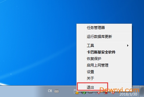 3、关闭自我保护之后在右下角哪里完全退出卡巴斯基软件