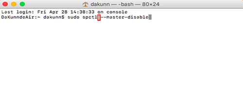 2、然后,输入代码:sudo spctl --master-disable(master前面为两个短横线)注意红框处是空格。