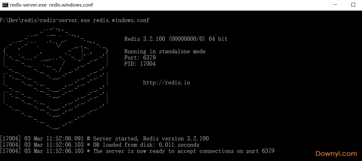 1、将下载的软件压缩包解压到redis文件夹下,并将其拷贝到索要存放的位置,比如说我的是f:devedis,在该文件夹下按住【shift】+鼠标右键,调出cmd控制台,运行redis-server.exe redis.windows.conf,如下图所示: