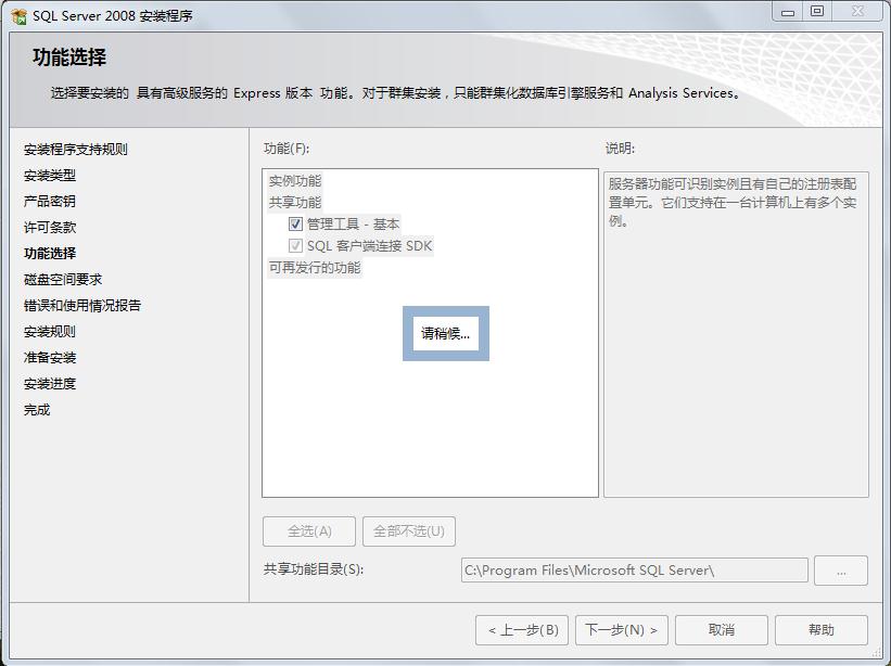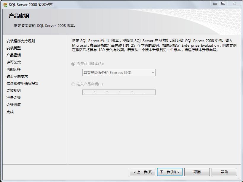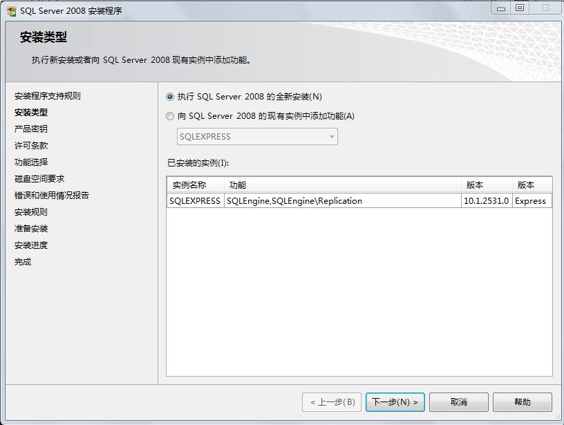 这个界面很重要,我们可以看到,在我们的机器上只安装了sqlengine,感觉如果选择“向sqlserver2008的现有的实例中添加新功能”也可以成功安装,但是我当时索性就选了上面的“执行sqlserver2008全新的安装”,经本人亲测可以成功安装,所以这里我们选择“执行sqlserver2008全新的安装”,然后单击下一步,会出现: