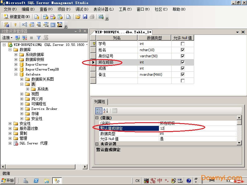 7、对于一个班级的同学,我们可以将所在班级的列设置一个默认值。这样写数据的时候如果不写所在班级系统就会自动填写上我们指定默认值。