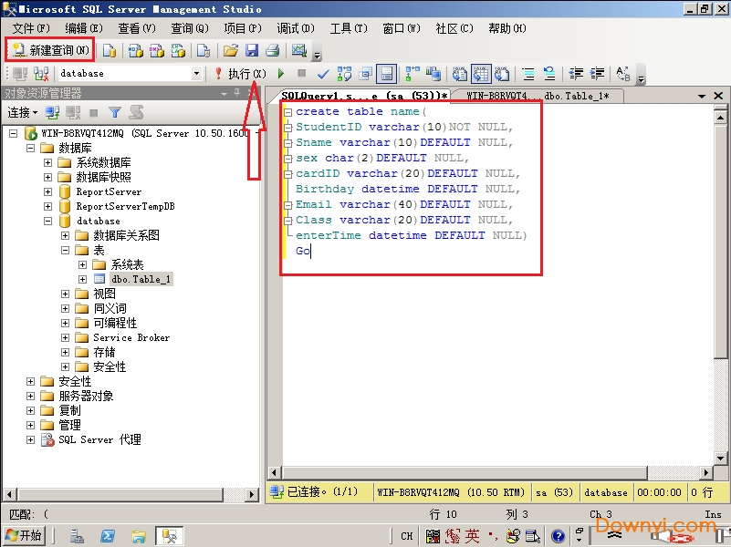 !!!首先create是创建的意思,table即表,name是给表起的名字。后面跟上(),()内的内容就是表的每一列;其中第一个字段为列的名字,然后是列的数据类型,后面的是否允许空值null。语句最后面的go即为执行。操作时,我们点击ssms左上角的“新建查询”-然后输入语句-点击“执行”