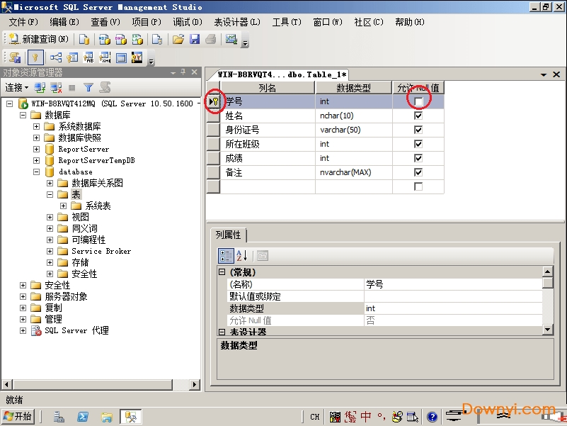4、大家都知每个学生的学号肯定都是独一无二的,所以我们可以将学号这一列设置为主键,不允许存在重复的