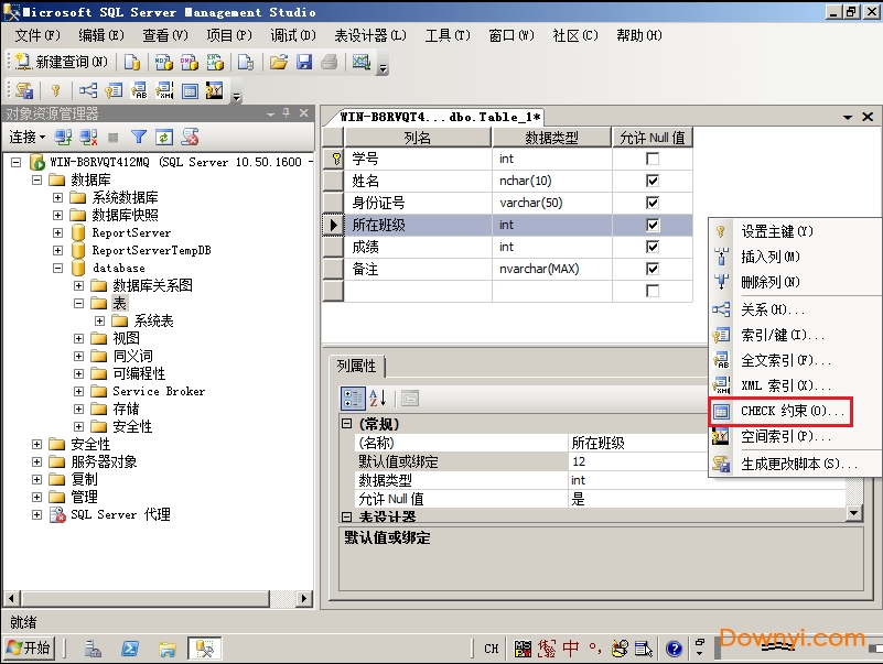 8、右键点击空白处-可以新建check约束,这样就可以限制数据的写入了。例如限制性别只能填写“男”或“女”;成绩限制0到100分。