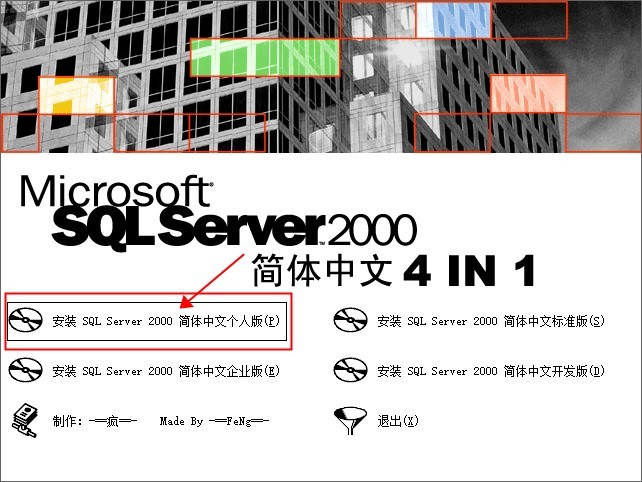 2、点击安装,这里以SQL Server 2000个人版为案例,其余的方法类似,如图:
