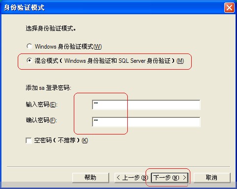 13、这里选择“混合模式(Windows 身份验证和SQL Server 身份验证)”,然后输入密码和输入确认密码均为sa(也可以设置更加复杂的密码,或者是先使用“混合模式”,等待软件安装好了以后再设置),点击下一步:
