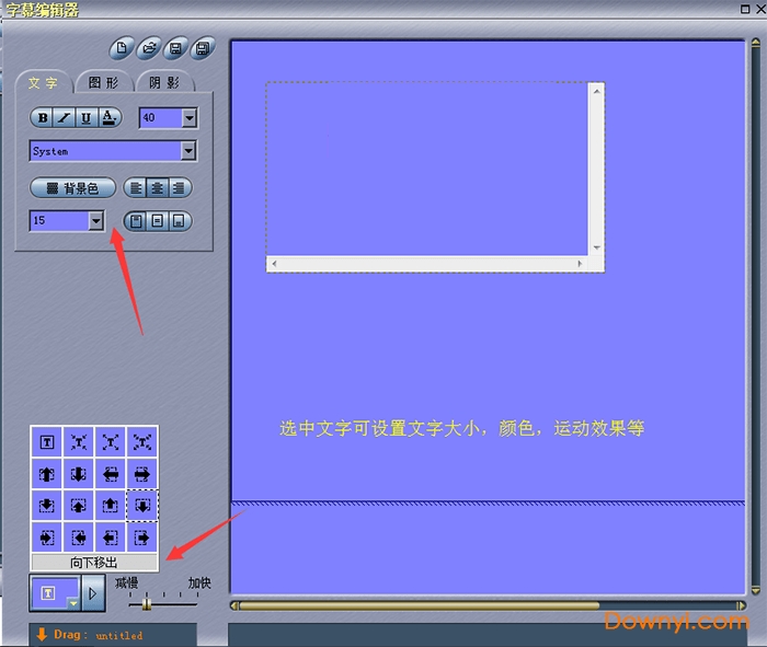 在文字编辑区输入字幕,通过拖动虚线可以调整编辑区的大小,输入完成以后,选中字幕文字在左边设置文字的颜色,大小,排列位置等,左下角可以设置字幕的活动方式,有向下移出,向右移出等等,速度可以调至缓慢,看的更清楚一些。