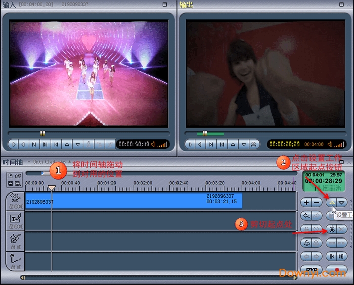 第二步继续移动时间轴浮标到截取的终点时间处,单击“设置工作区域终点”按钮,然后点击切分片段,剪切的终点就设置完成。再回头看视频轨道这里,视频已经被切分成三个片段了。