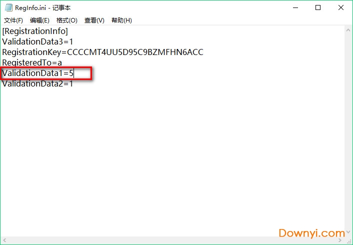 2、右键点击,以记事本方式打开“reginfo.ini”,在第五行=后面随便添加一个字符,如:validationdata1=5,添加好后保存再关闭文件。