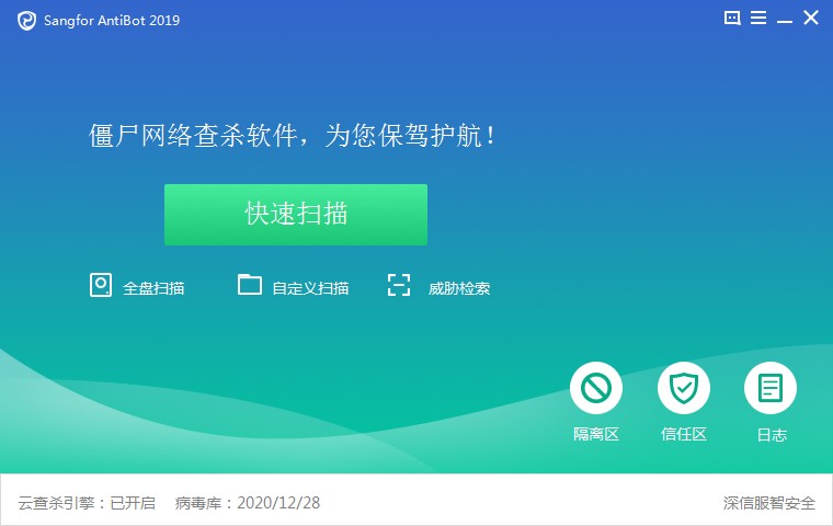 功能强大、专业实用的僵尸网络查杀工具,sangfor antibot 2019官方版集成了多引擎检测能力并且支持多种扫描方式。这样就能够帮助用户快速高效的查找出系统中所存在的病毒文件,然后可以快速对其进行清除。这样用户就不用担心电脑被病毒所损害的问题了。