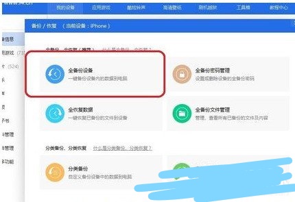 3、点击上方的设备信息按钮,然后在点击备份/恢复,选择其恢复。