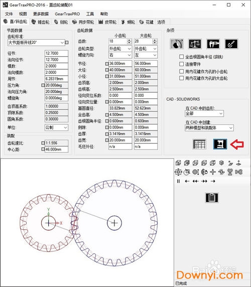 如图,对各种参数进行设置后,点击红色箭头处按钮,即可在Solidworks中自动生成模型。