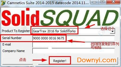2.然后再到解压后的软件包下面,打开“_SolidSQUAD_”文件夹下面的“Camnetics.Suite.2016.LicGen.15092015.SSQ.exe”注册机,第一个选框选择“GearTrax 2016 for SolidWorks”,第二个选框宣泄你之前复制的序列号,然后在第三第四个选框内填入你的邮箱和公司名,最后点击“Register”。