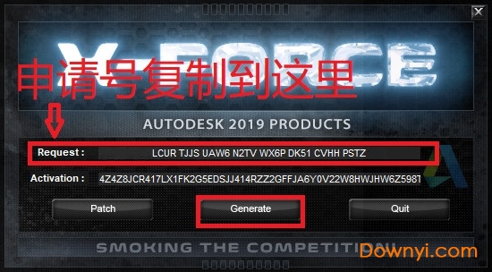 6、将申请号复制到注册机request框中并点击“generate按钮”生成激活码;